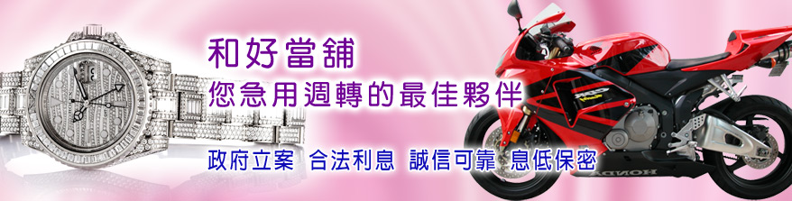和好當舖位於台北市長安東路2段169-10號,是一家政府立案、合法經營的優質當舖,除了提供各式流當品拍賣,更提供汽機車借款免留車、黃金、鑽石、名錶、工商融資.汽車借款.
